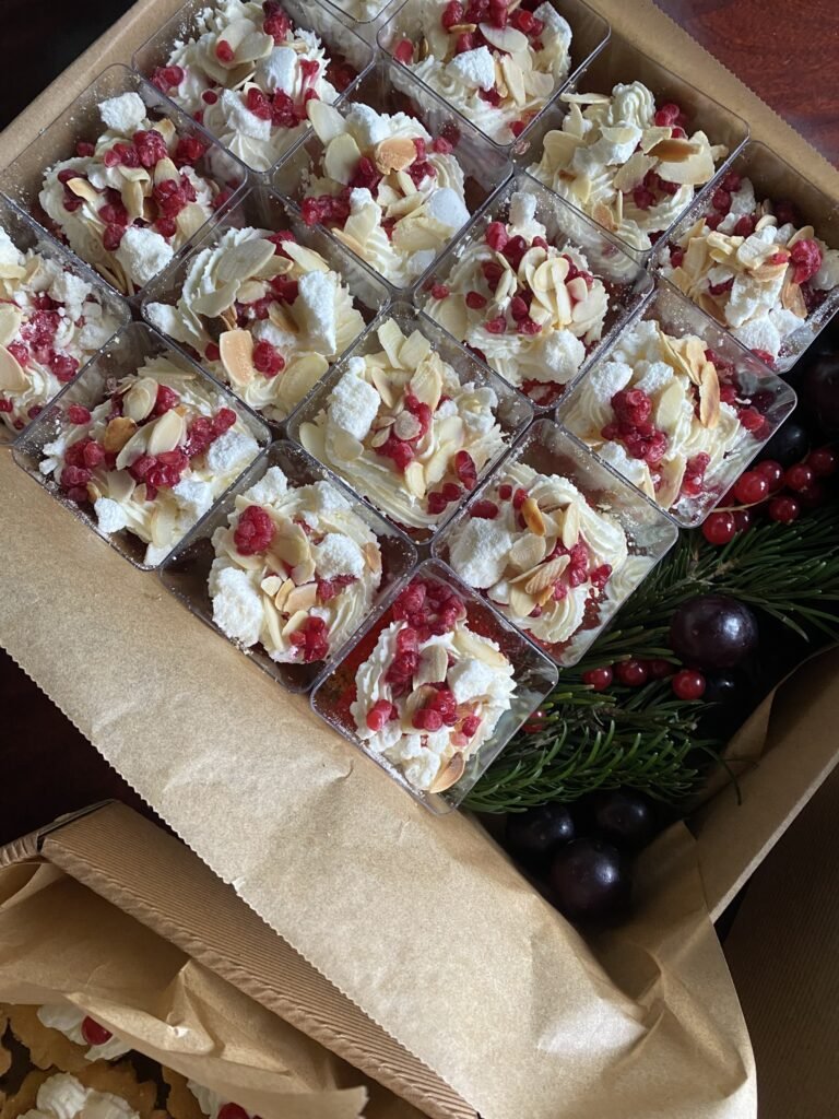 - Malinowa chmurka w monoporcji (herbatniki, krem z mascarpone, mus malinowy, pokruszona beza)